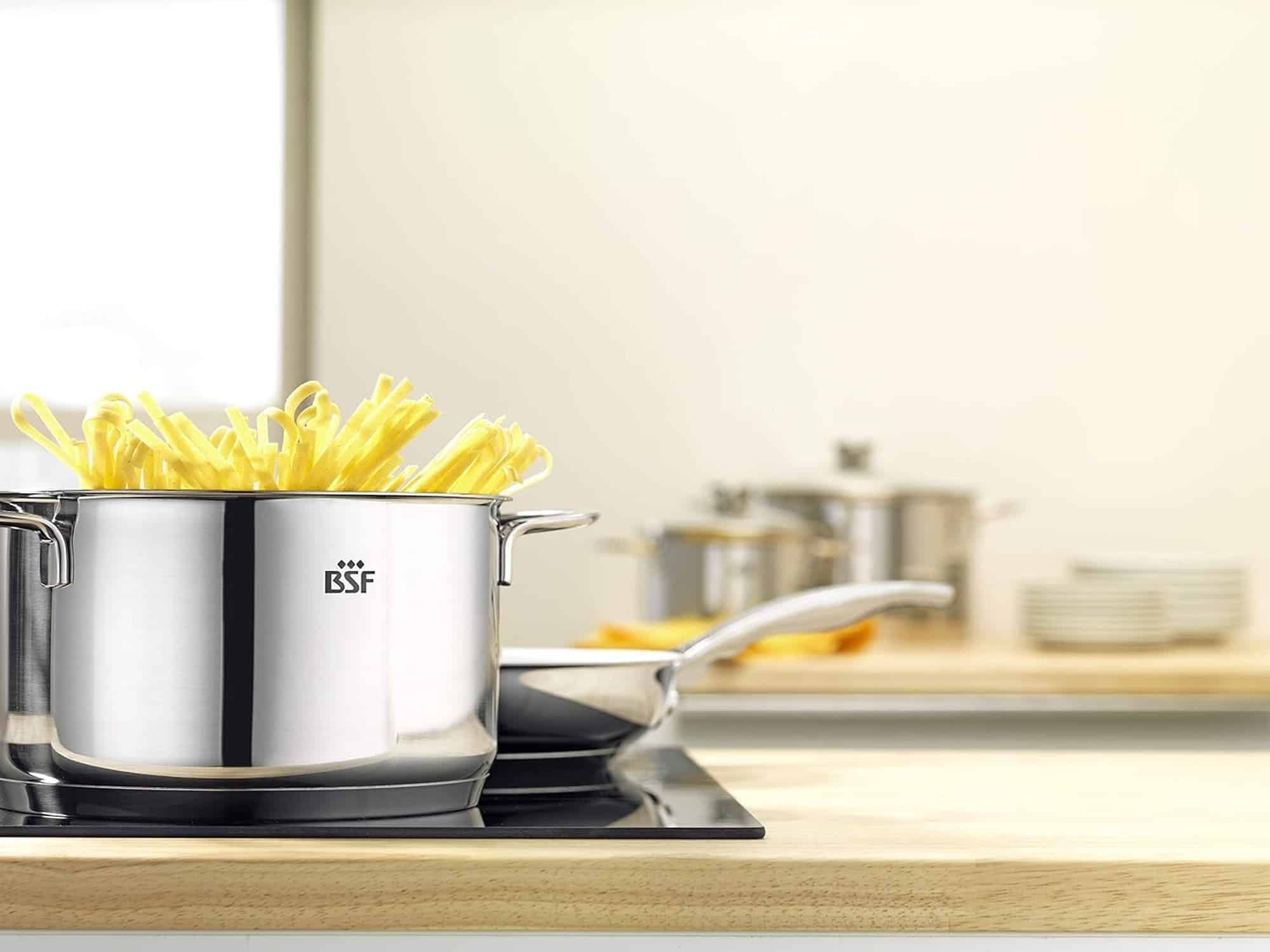 Diese Töpfe haben einen Sandwichboden mit einem Kern aus Aluminium, der die Hitze optimal verteilt. Das Kochgeschirrset von BSF können Sie auf jeder Herdart und sogar auf einem Induktionskochfeld verwenden.