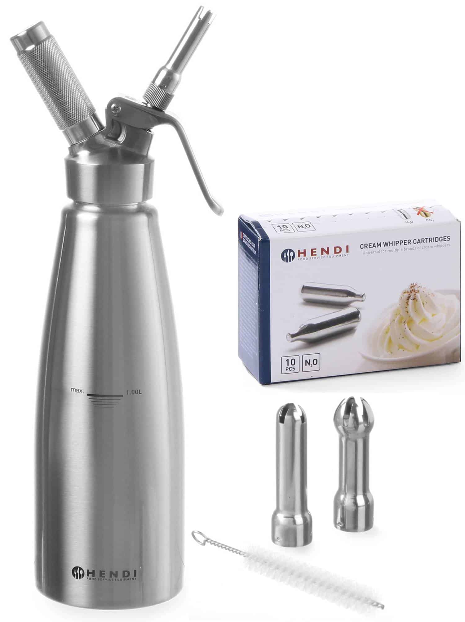 Hendi 1 Liter N2O Sahnespender aus Edelstahl + 10x Sahne-Kapseln Silber NEU